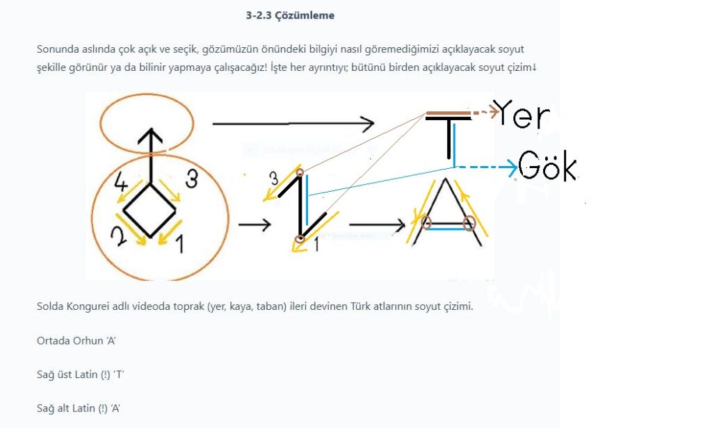 Dilci öğretim üyeleriyle neden çatıştığımı sanırım anladım: Onlar seslerin tek başına anlam taşımaz diye diretirlerken onlar benim göstergelerin şekilleri ile onun ses değerini birbirinden bağımsız incelediğimi düşünmüş olmalılar! Ya da benim anlamla birlikte, anlamın dışına çıkmadan sesi, anlamı ve ikisini birlikte imgeleyen göstergeyi (yazaç, tanılık töz) ; üçünü birbirinden ayırmadan çözmeye çalıştığımı kavrayamamış olmalılar! Oysa bu çalışmada A ve T seslerini At canlısının devinimiyle ilişkilendirerek çözümlemeye çalıştım. Anlamı devinim olarak ve A sesinin karşılığı olarak ve şeklini Orhun abecesindeki A gibi çözmeye çalıştım. Bütünden ‘A’yı çektim iki bilinmeyenli denk gelme çözer gibi. Sonra aynı biçimde kalın ‘T’yi. Kalın T ise sesin ortaya çıkabilmesi için zorunlu olarak; çarpma yüzeyi (Toprak) olarak çözümlendi. Şekli ise yerin yüzeyi ve ona eklenen dik çizgi (göğü) ile kalın ‘T’yi açıkladım.